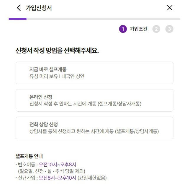 아래 메뉴 중 "지금 바로 셀프개통"을 클릭해야 합니다.