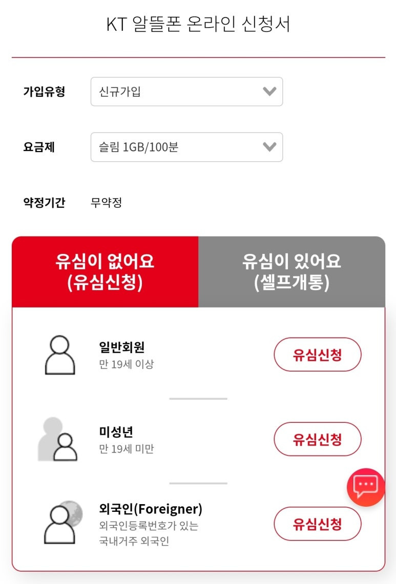 요금제 선택 -> 다음 -> 성인 (2004년 이전 출생) ->
