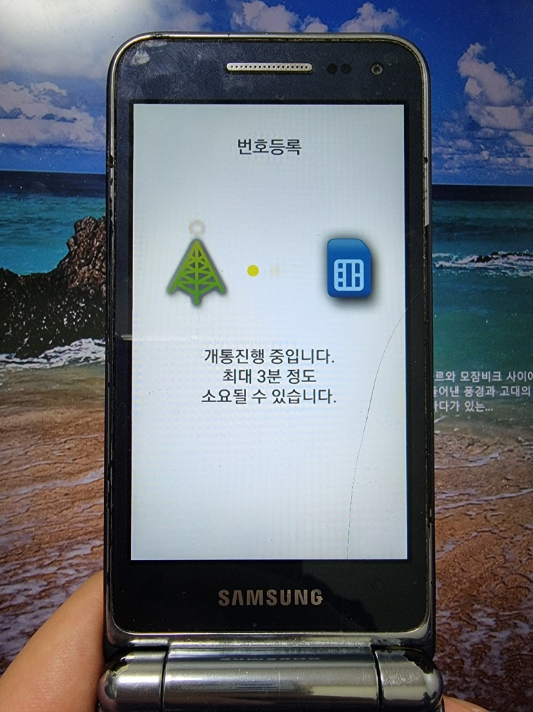 전원을 켠 후 번호등록을 누르면 개통이 완료됩니다.